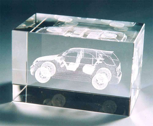 在水晶、玻璃等透明材料內雕刻平面或三維立體圖案。